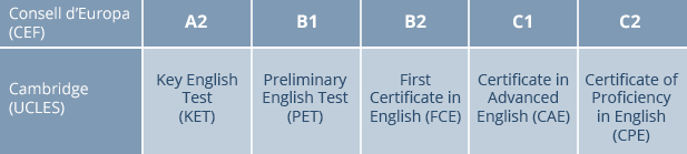 Cursos dissenyats per treure l’entrellat dels exàmens de Cambridge (KET / PET / FCE / CAE / CPE). Maximitzarem les possibilitats d’èxit a través de l’anàlisi de les diferents parts del test i dels “trucs” i estratègies més adients per afrontar-lo. A més, facilitarem una extensa pràctica d’exàmens, tant a nivell presencial com remot- des d’on siguis, a través de la nostra plataforma online, l’Activa Board®. Aquests cursos són compatibles amb qualsevol dels cursos que oferim. Cal remarcar que la superació d’exàmens de Cambridge és d’especial interés per a persones que es preparin per anar a la universitat o que ja hi siguin. Els titols FCE i CAE (First Certificate in English i Certificate in Advanced English) de Cambridge ESOL, són vàlids per a la consecució de crèdits o per a l'accés a cursos, màsters o postgraus* (*) Comprova aquí si la universitat a la que desitges anar reconeix els títols de Cambridge ESOL. Més informació |